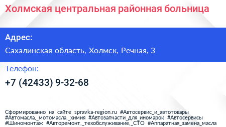 Холмская центральная районная больница по адресу Сахалинская область, Холмск, Речная, 3 в дальнейшем Организация, размещена в следующих категориях: