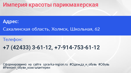 Империя красоты, парикмахерская по адресу Сахалинская область, Холмск, Школьная, 62 в дальнейшем Организация, размещена в следующих категориях: