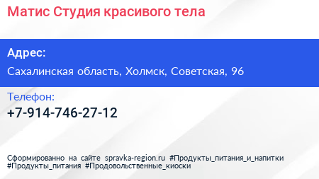 Матис, Студия красивого тела по адресу Сахалинская область, Холмск, Советская, 96 в дальнейшем Организация, размещена в следующих категориях: