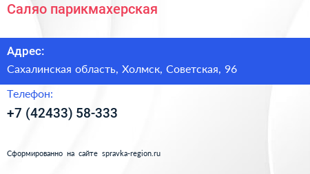 Саляо, парикмахерская по адресу Сахалинская область, Холмск, Советская, 96 в дальнейшем Организация, размещена в следующих категориях: