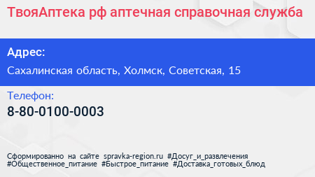 ТвояАптека.рф, аптечная справочная служба по адресу Сахалинская область, Холмск, Советская, 15 в дальнейшем Организация, размещена в следующих категориях:
