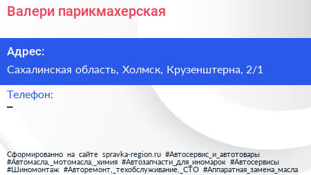 Валери, парикмахерская по адресу Сахалинская область, Холмск, Крузенштерна, 2/1 в дальнейшем Организация, размещена в следующих категориях: