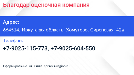 Благодар, оценочная компания по адресу 664514, Иркутская область, Хомутово, Сиреневая, 42а в дальнейшем Организация, размещена в следующих категориях: