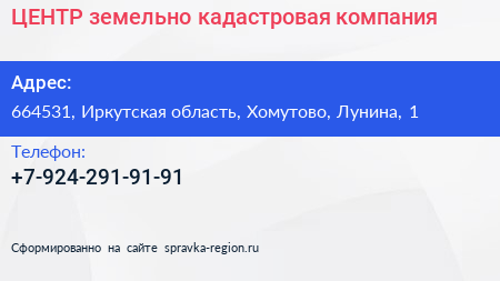 ЦЕНТР, земельно-кадастровая компания по адресу 664531, Иркутская область, Хомутово, Лунина, 1 в дальнейшем Организация, размещена в следующих категориях: