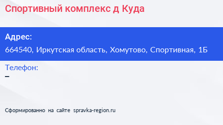 Спортивный комплекс, д. Куда по адресу 664540, Иркутская область, Хомутово, Спортивная, 1Б в дальнейшем Организация, размещена в следующих категориях: