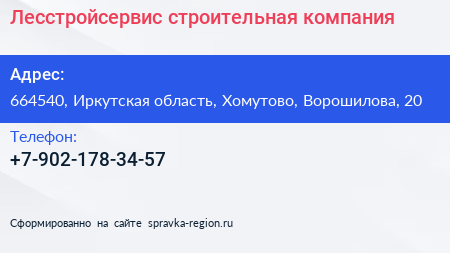 Лесстройсервис, строительная компания по адресу 664540, Иркутская область, Хомутово, Ворошилова, 20 в дальнейшем Организация, размещена в следующих категориях: