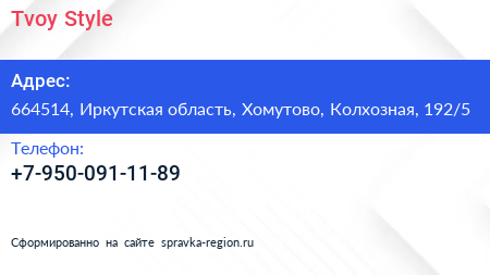 Tvoy Style по адресу 664514, Иркутская область, Хомутово, Колхозная, 192/5 в дальнейшем Организация, размещена в следующих категориях: