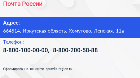 Почта России по адресу 664514, Иркутская область, Хомутово, Ленская, 11а в дальнейшем Организация, размещена в следующих категориях:
