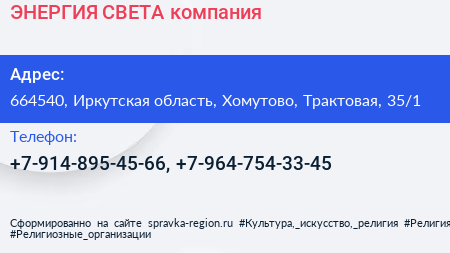ЭНЕРГИЯ СВЕТА, компания по адресу 664540, Иркутская область, Хомутово, Трактовая, 35/1 в дальнейшем Организация, размещена в следующих категориях: