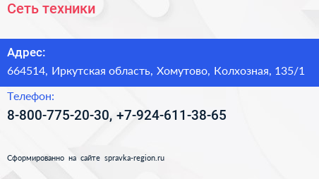 Сеть техники по адресу 664514, Иркутская область, Хомутово, Колхозная, 135/1 в дальнейшем Организация, размещена в следующих категориях: