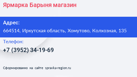 Ярмарка Барыня, магазин по адресу 664514, Иркутская область, Хомутово, Колхозная, 135 в дальнейшем Организация, размещена в следующих категориях: