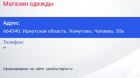 Магазин одежды по адресу 664540, Иркутская область, Хомутово, Чапаева, 10а в дальнейшем Организация, размещена в следующих категориях: