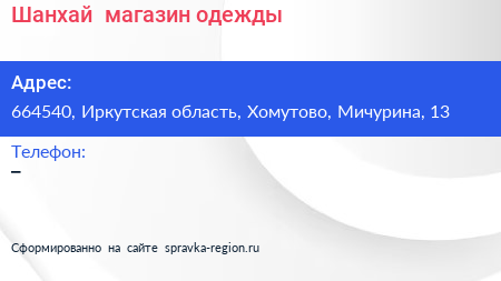 Шанхай+, магазин одежды по адресу 664540, Иркутская область, Хомутово, Мичурина, 13 в дальнейшем Организация, размещена в следующих категориях:
