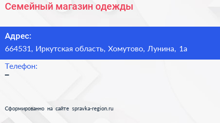 Семейный, магазин одежды по адресу 664531, Иркутская область, Хомутово, Лунина, 1а в дальнейшем Организация, размещена в следующих категориях: