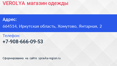 VEROLYA, магазин одежды по адресу 664514, Иркутская область, Хомутово, Янтарная, 2 в дальнейшем Организация, размещена в следующих категориях: