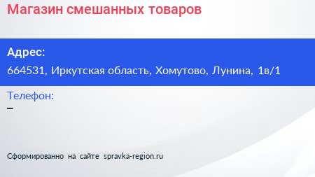 Магазин смешанных товаров по адресу 664531, Иркутская область, Хомутово, Лунина, 1в/1 в дальнейшем Организация, размещена в следующих категориях: