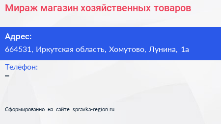 Мираж, магазин хозяйственных товаров по адресу 664531, Иркутская область, Хомутово, Лунина, 1а в дальнейшем Организация, размещена в следующих категориях:
