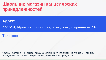 Школьник, магазин канцелярских принадлежностей по адресу 664514, Иркутская область, Хомутово, Сиреневая, 1Б в дальнейшем Организация, размещена в следующих категориях: