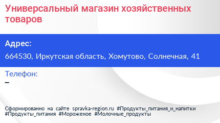 Универсальный, магазин хозяйственных товаров по адресу 664530, Иркутская область, Хомутово, Солнечная, 41 в дальнейшем Организация, размещена в следующих категориях: