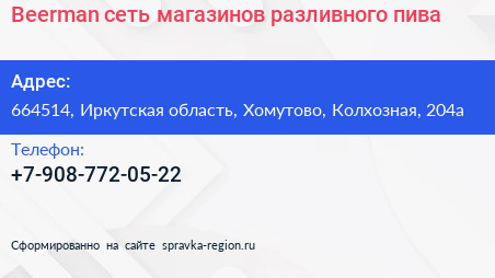Beerman, сеть магазинов разливного пива по адресу 664514, Иркутская область, Хомутово, Колхозная, 204а в дальнейшем Организация, размещена в следующих категориях: