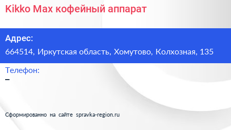 Kikko Max, кофейный аппарат по адресу 664514, Иркутская область, Хомутово, Колхозная, 135 в дальнейшем Организация, размещена в следующих категориях: