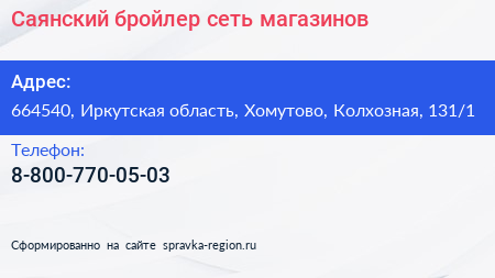 Саянский бройлер, сеть магазинов по адресу 664540, Иркутская область, Хомутово, Колхозная, 131/1 в дальнейшем Организация, размещена в следующих категориях: