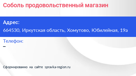 Соболь, продовольственный магазин по адресу 664530, Иркутская область, Хомутово, Юбилейная, 19а в дальнейшем Организация, размещена в следующих категориях: