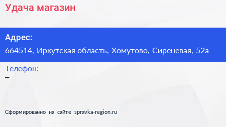 Удача, магазин по адресу 664514, Иркутская область, Хомутово, Сиреневая, 52а в дальнейшем Организация, размещена в следующих категориях: