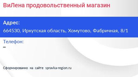 ВиЛена, продовольственный магазин по адресу 664530, Иркутская область, Хомутово, Фабричная, 8/1 в дальнейшем Организация, размещена в следующих категориях: