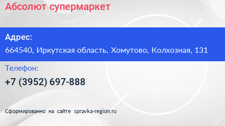 Абсолют, супермаркет по адресу 664540, Иркутская область, Хомутово, Колхозная, 131 в дальнейшем Организация, размещена в следующих категориях: