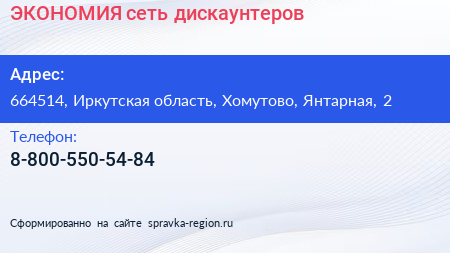 ЭКОНОМИЯ, сеть дискаунтеров по адресу 664514, Иркутская область, Хомутово, Янтарная, 2 в дальнейшем Организация, размещена в следующих категориях: