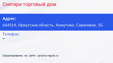 Снегири, торговый дом по адресу 664514, Иркутская область, Хомутово, Сиреневая, 1Б в дальнейшем Организация, размещена в следующих категориях: