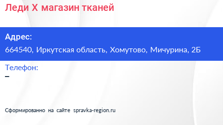 Леди Х, магазин тканей по адресу 664540, Иркутская область, Хомутово, Мичурина, 2Б в дальнейшем Организация, размещена в следующих категориях: