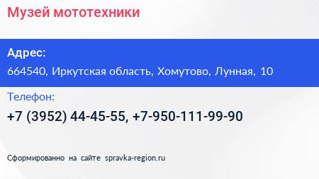 Музей мототехники по адресу 664540, Иркутская область, Хомутово, Лунная, 10 в дальнейшем Организация, размещена в следующих категориях: