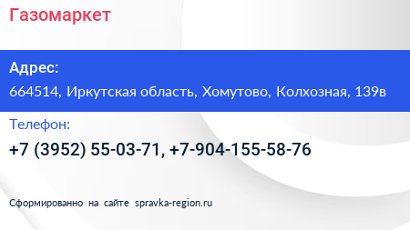 Газомаркет по адресу 664514, Иркутская область, Хомутово, Колхозная, 139в в дальнейшем Организация, размещена в следующих категориях: