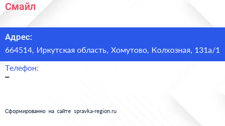 Смайл по адресу 664514, Иркутская область, Хомутово, Колхозная, 131а/1 в дальнейшем Организация, размещена в следующих категориях: