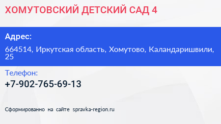 ХОМУТОВСКИЙ ДЕТСКИЙ САД №4 по адресу 664514, Иркутская область, Хомутово, Каландаришвили, 25 в дальнейшем Организация, размещена в следующих категориях: