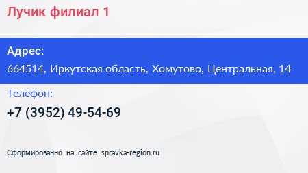Лучик, филиал №1 по адресу 664514, Иркутская область, Хомутово, Центральная, 14 в дальнейшем Организация, размещена в следующих категориях: