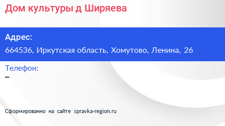 Дом культуры, д. Ширяева по адресу 664536, Иркутская область, Хомутово, Ленина, 26 в дальнейшем Организация, размещена в следующих категориях: