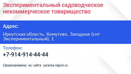 Экспериментальный, садоводческое некоммерческое товарищество по адресу Иркутская область, Хомутово, Западная (снт Экспериментальный), 1 в дальнейшем Организация, размещена в следующих категориях: