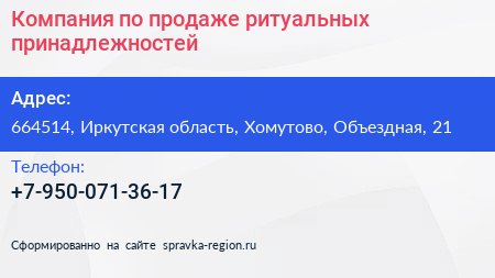 Компания по продаже ритуальных принадлежностей по адресу 664514, Иркутская область, Хомутово, Объездная, 21 в дальнейшем Организация, размещена в следующих категориях: