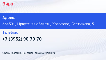 Вира по адресу 664531, Иркутская область, Хомутово, Бестужева, 5 в дальнейшем Организация, размещена в следующих категориях:
