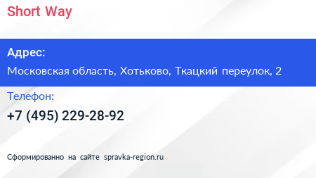Short Way по адресу Московская область, Хотьково, Ткацкий переулок, 2 в дальнейшем Организация, размещена в следующих категориях: