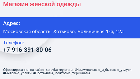 Магазин женской одежды по адресу Московская область, Хотьково, Больничная 1-я, 12а в дальнейшем Организация, размещена в следующих категориях: