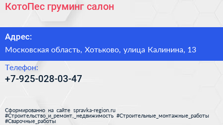 КотоПес, груминг-салон по адресу Московская область, Хотьково, улица Калинина, 13 в дальнейшем Организация, размещена в следующих категориях: