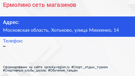 Ермолино, сеть магазинов по адресу Московская область, Хотьково, улица Михеенко, 14 в дальнейшем Организация, размещена в следующих категориях: