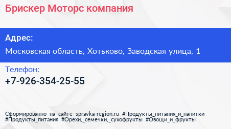 Брискер-Моторс, компания по адресу Московская область, Хотьково, Заводская улица, 1 в дальнейшем Организация, размещена в следующих категориях: