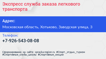 Экспресс, служба заказа легкового транспорта по адресу Московская область, Хотьково, Заводская улица, 3 в дальнейшем Организация, размещена в следующих категориях: