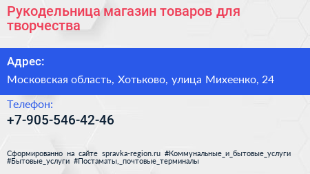 Рукодельница, магазин товаров для творчества по адресу Московская область, Хотьково, улица Михеенко, 24 в дальнейшем Организация, размещена в следующих категориях: