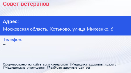 Совет ветеранов по адресу Московская область, Хотьково, улица Михеенко, 6 в дальнейшем Организация, размещена в следующих категориях:
